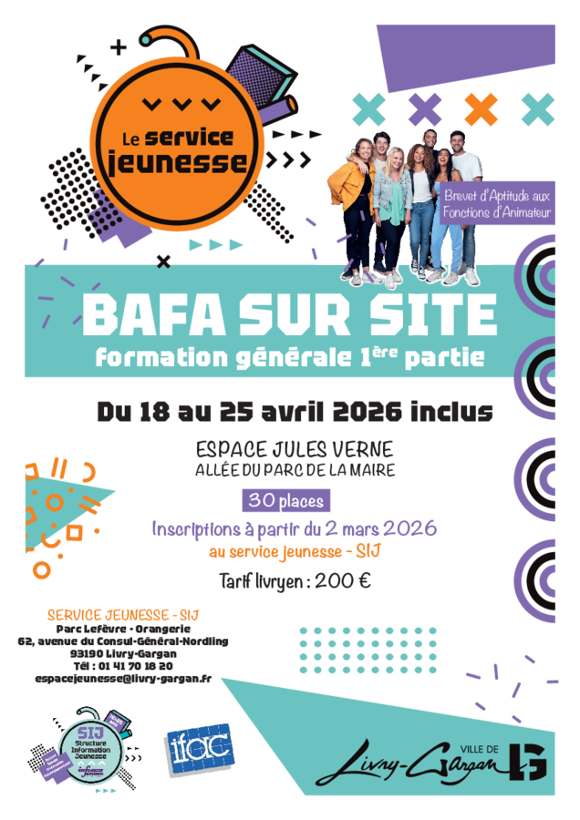 Du samedi 18 au samedi 25 avril 2026, la Ville de Livry-Gargan et l'Institut de formation, d'animation et de conseil (Ifac) s'associent pour proposer la formation générale au Brevet d’Aptitude aux Fonctions d’Animateur (BAFA), qui permet d’acquérir les notions de bases pour assurer les fonctions d’animation.